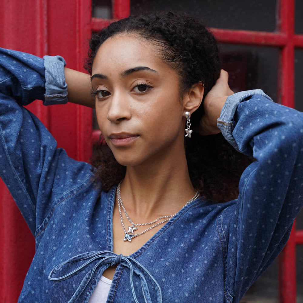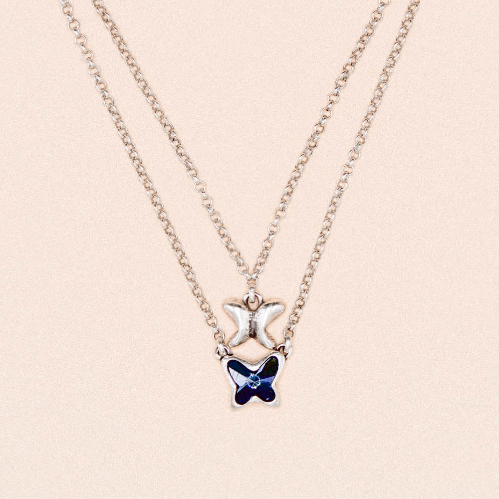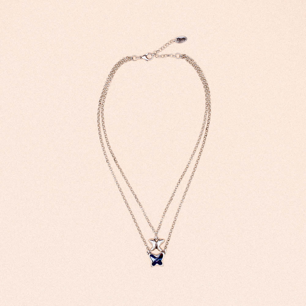 This exquisite double strand silver necklace features a stunning blue crystal butterfly, adding a touch of elegance and charm to any outfit. The intricate design is perfect for those who appreciate timeless beauty and delicate details. Elevate your style with the Adonis Necklace.