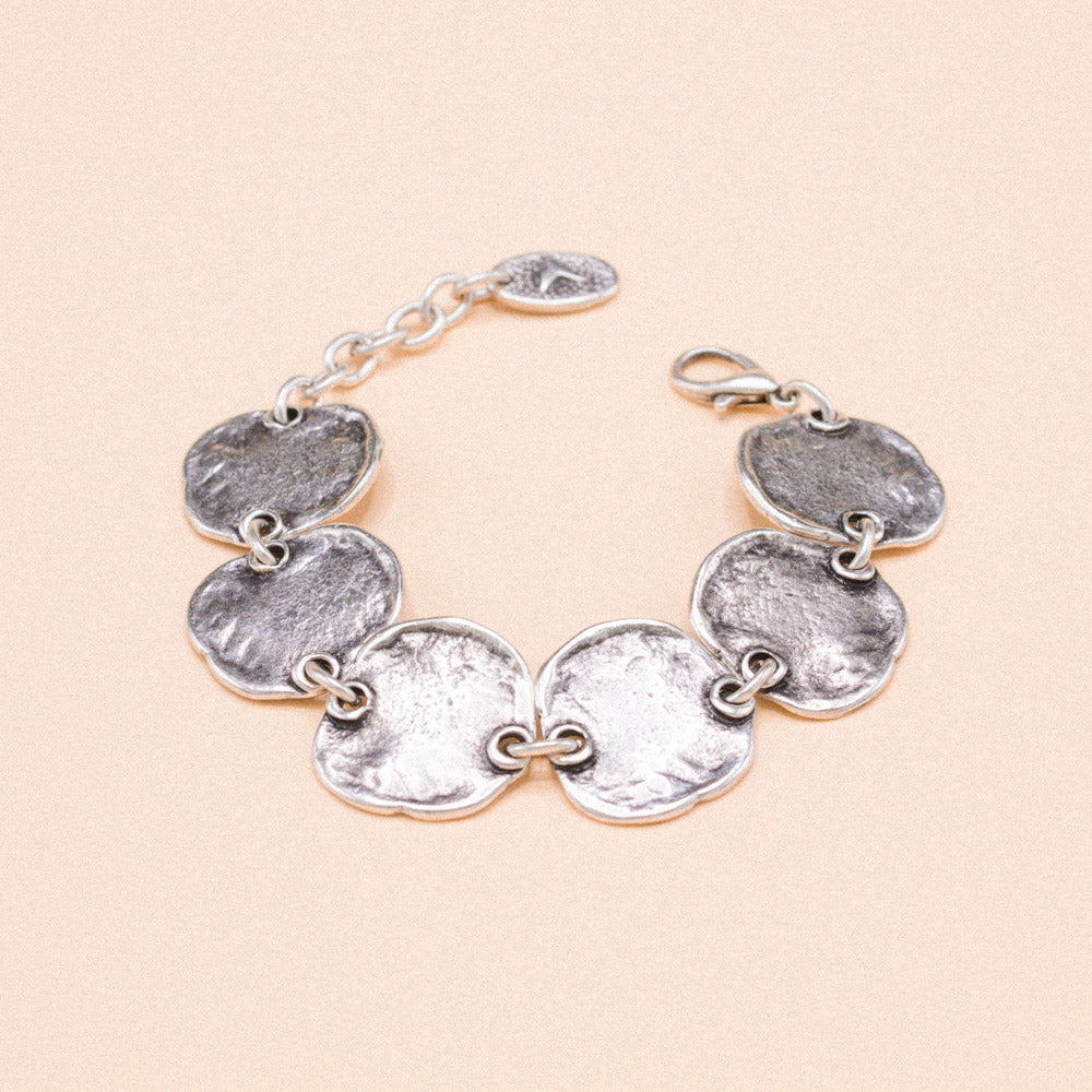 This bracelet features a series of textured circles linked along a chain that mirrors the matching necklace and earrings. The subtle texture adds depth and interest, whilst it's lightweight feel makes it perfect for everyday wear. A versatile piece that can be worn solo for a touch of detail or paired with the full set for a coordinated look.