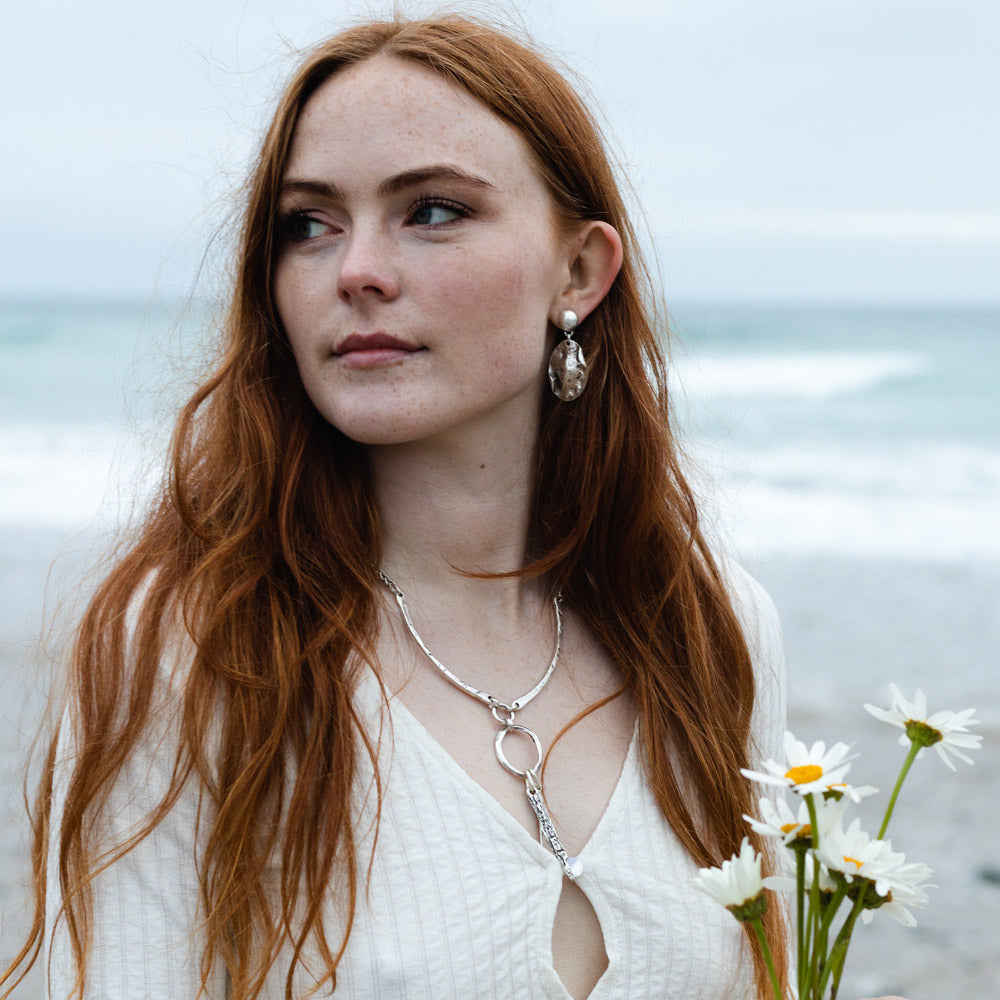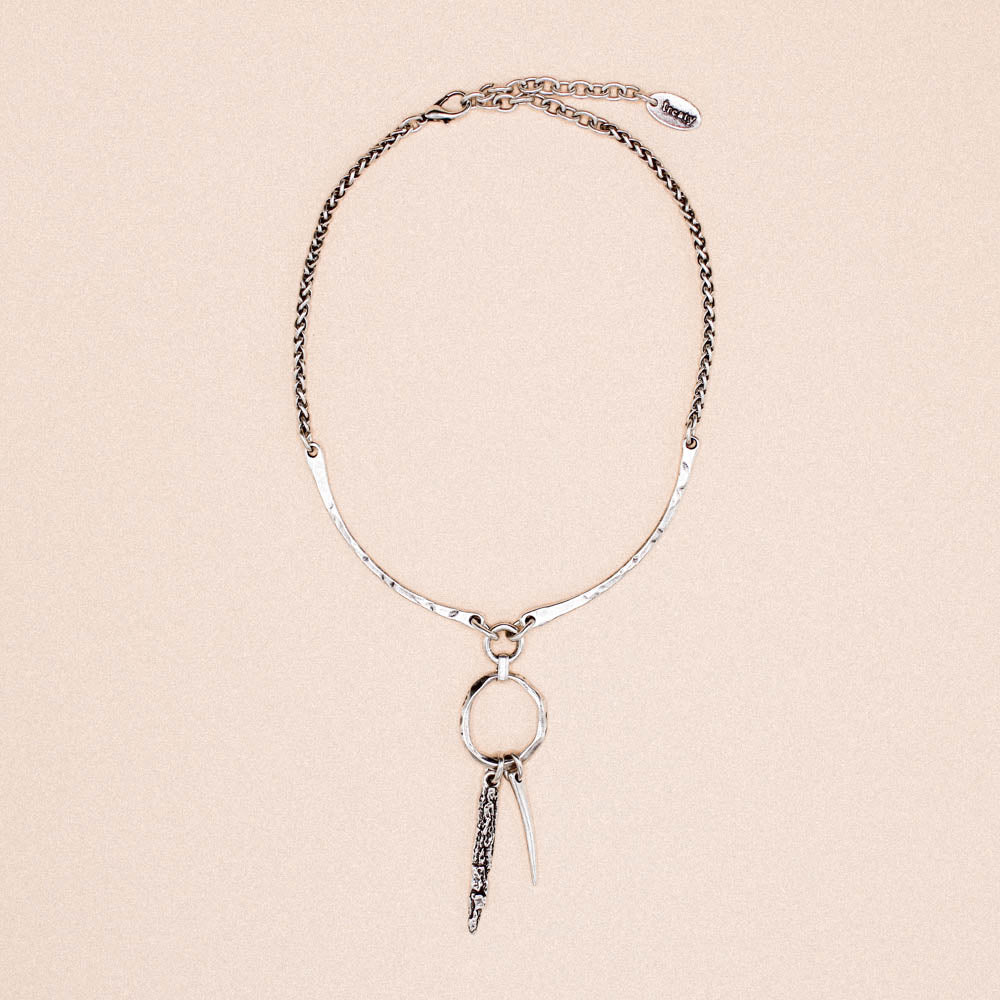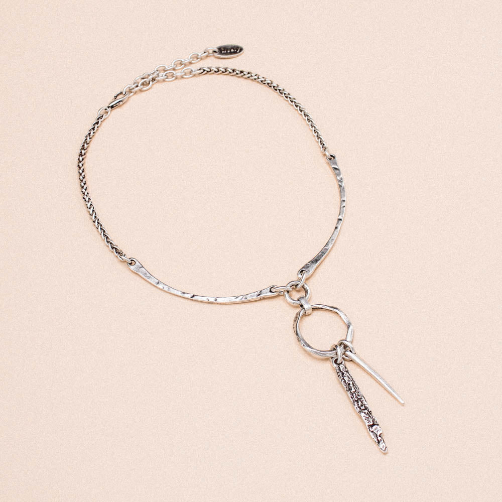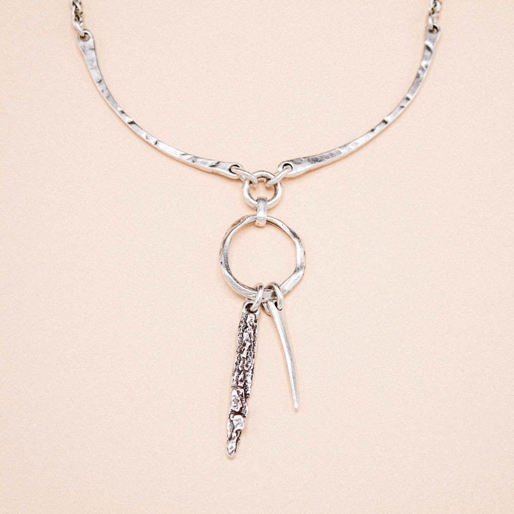 Introducing the stunning Capri Necklace— inspired by the dream-catcher, it's a distinctive and alluring piece that redefines elegance with an edgy twist. This silver necklace features two gracefully arched bars connected by an irregular hoop and with two raw spikes.