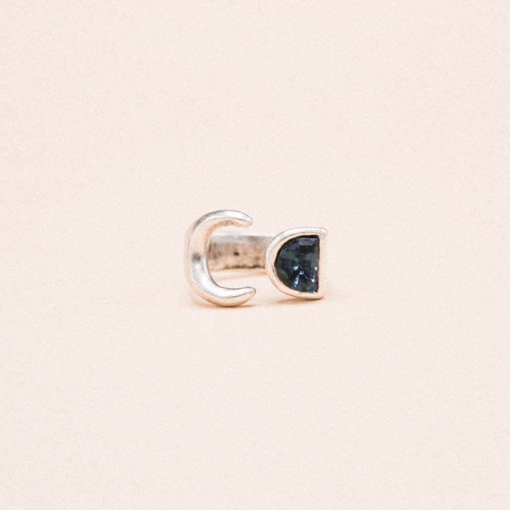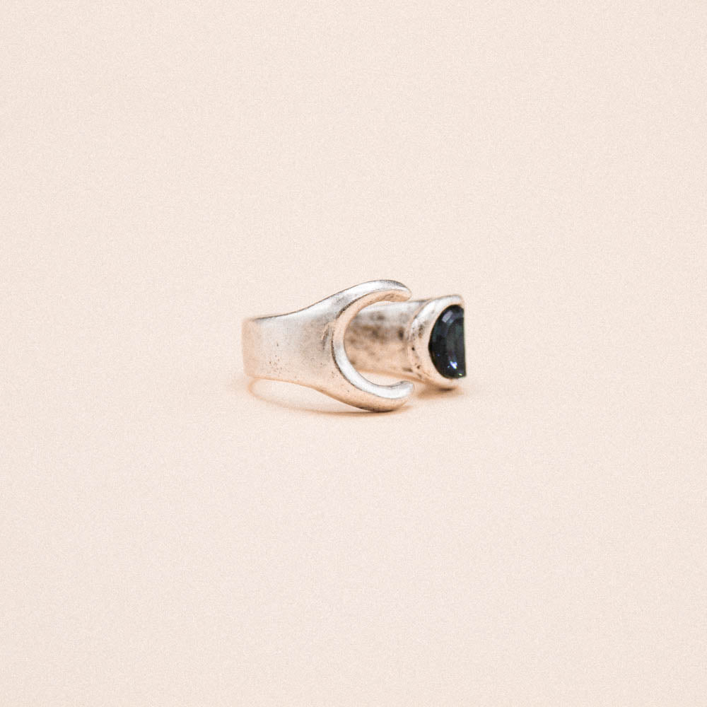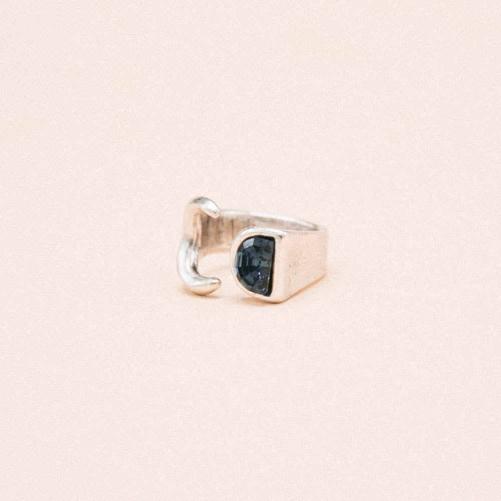Introducing the enchanting Cara Ring—a stunning adjustable ring that encapsulates celestial beauty and captivating elegance. It features a deep blue semi-circle crystal paired with a delicate silver moon crescent, evoking the serene mystique of the night sky.