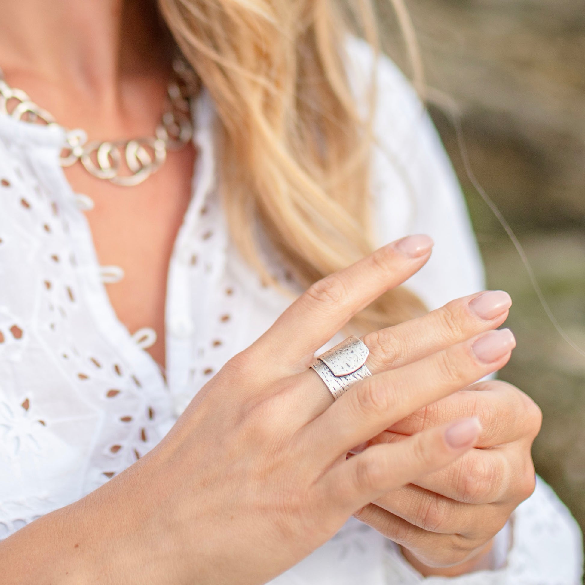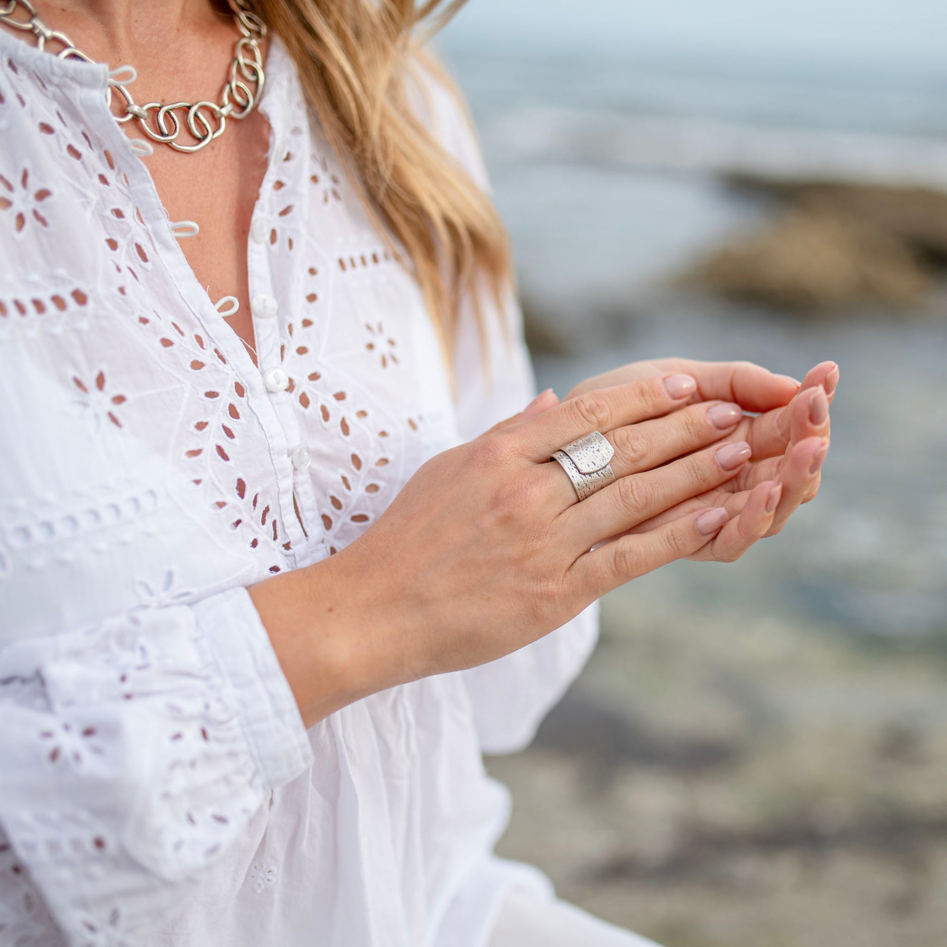 Get ready to elevate your look with the Kendra Ring! This versatile silver ring is perfect for everyday wear, with its adjustable design fitting seamlessly into your lifestyle. Spice up any outfit and turn heads with this must-have addition to your jewellery collection. No more boring accessories here!
