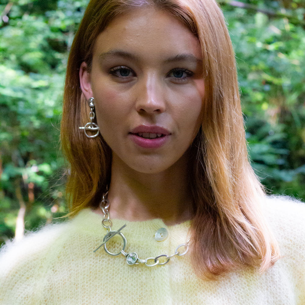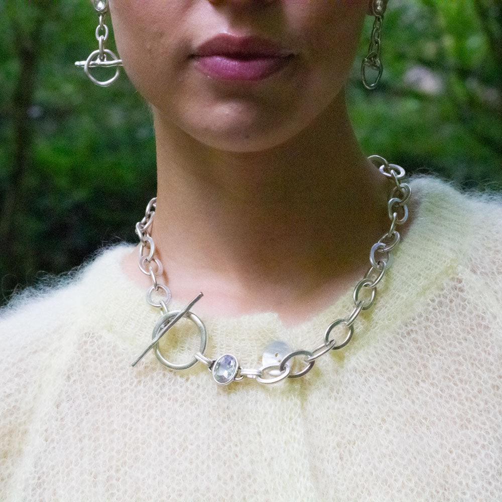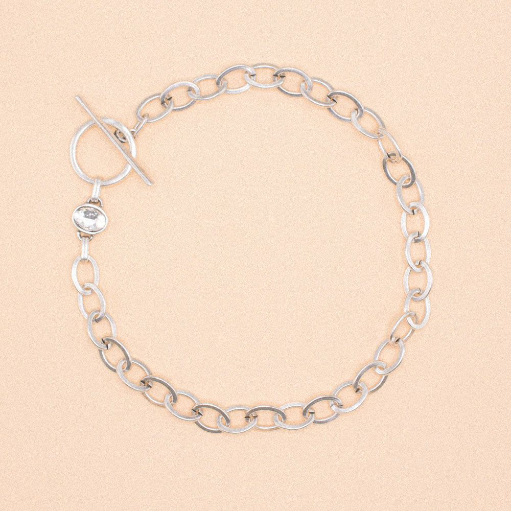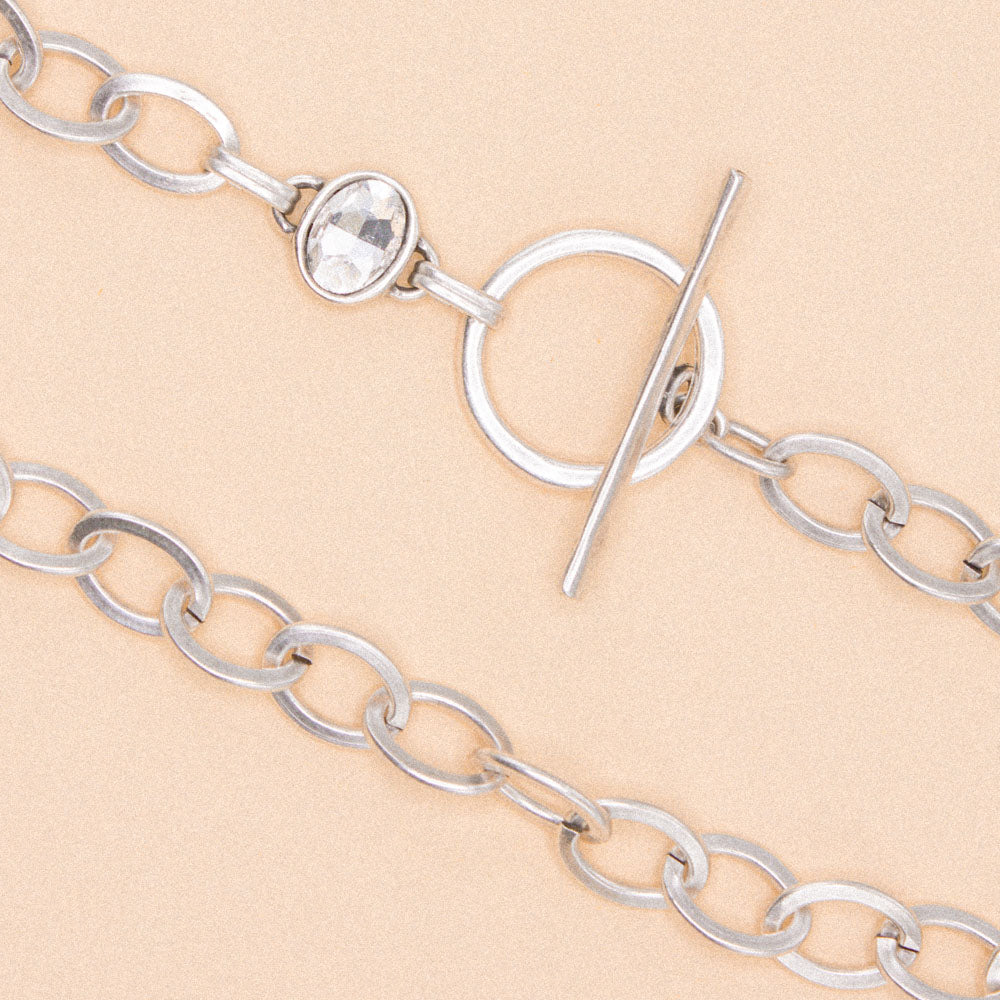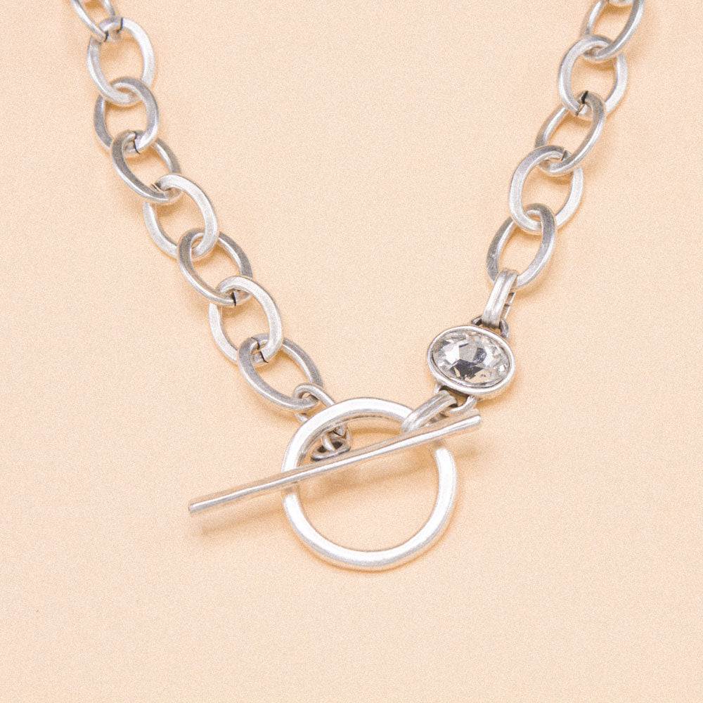 A modern twist on a classic chain. This necklace features large oval links, designed to be worn with the polished T-bar clasp at the front as a focal point. Just above the clasp, a clear gemstone is set on one side, adding a subtle touch of sparkle.