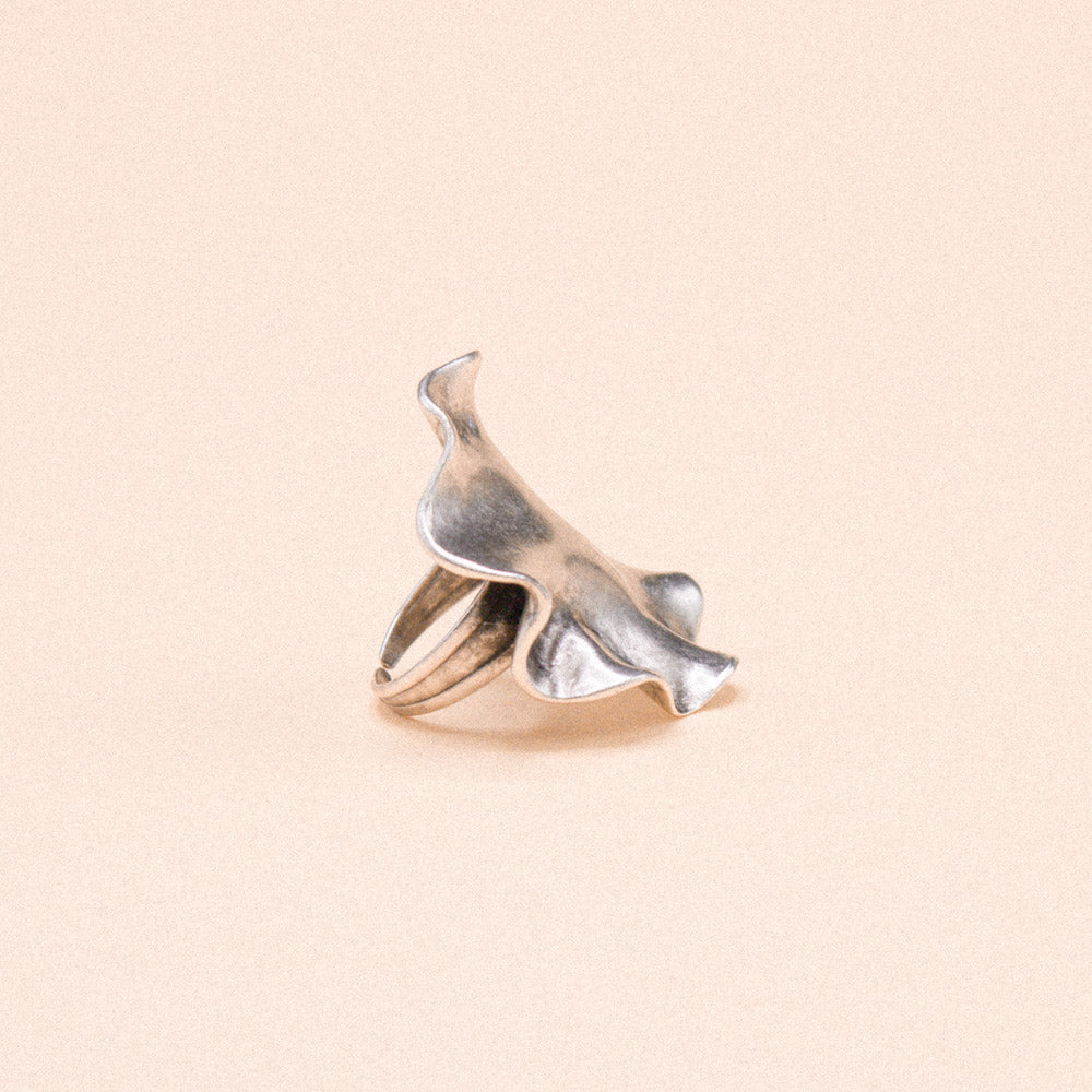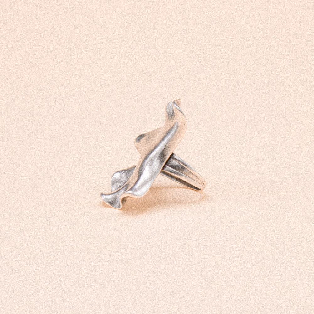 Our Patsy Ring, inspired by our famous Cornish Pasties, features a large, curved silver form with an abstract shape that makes each angle unique. It's sculptural design catches the light beautifully, offering a contemporary piece that's both expressive and wearable.