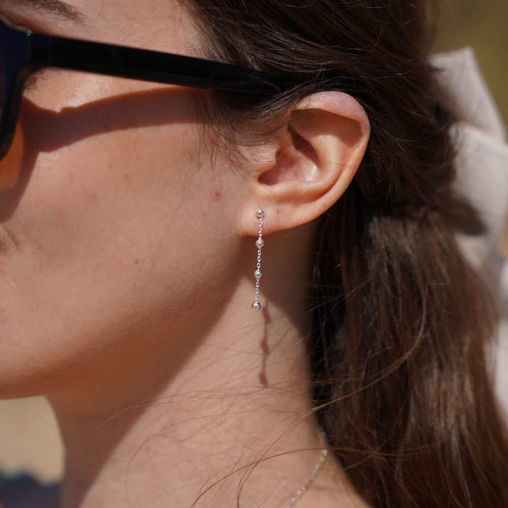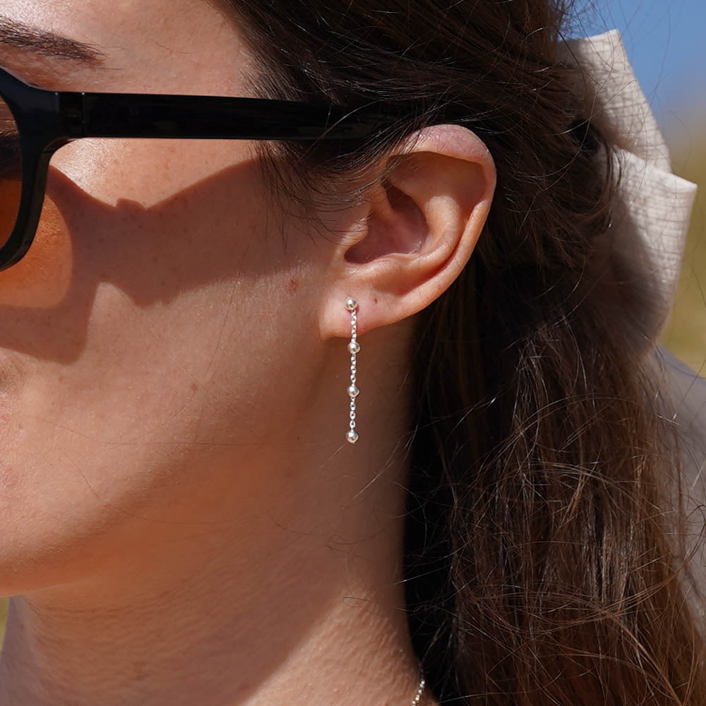 Continuing the elegant and timeless story of the Pixie family, are the beautiful Pixie Drop Earrings. Made with the same Sterling Silver ball and trace chain as the necklace and bracelet these delectable drops are post and backs. Simply a must to complete the look.