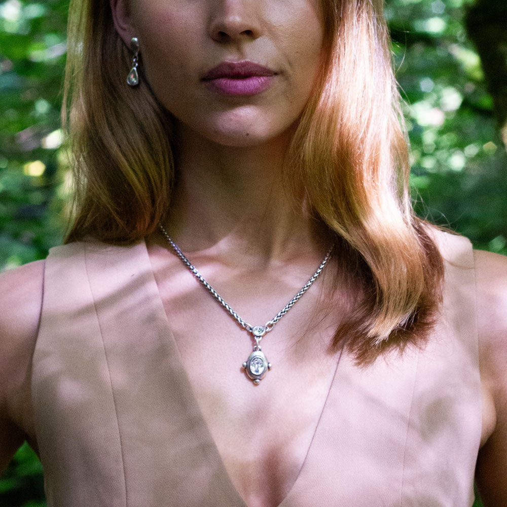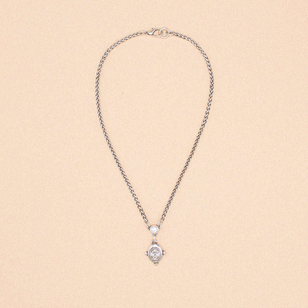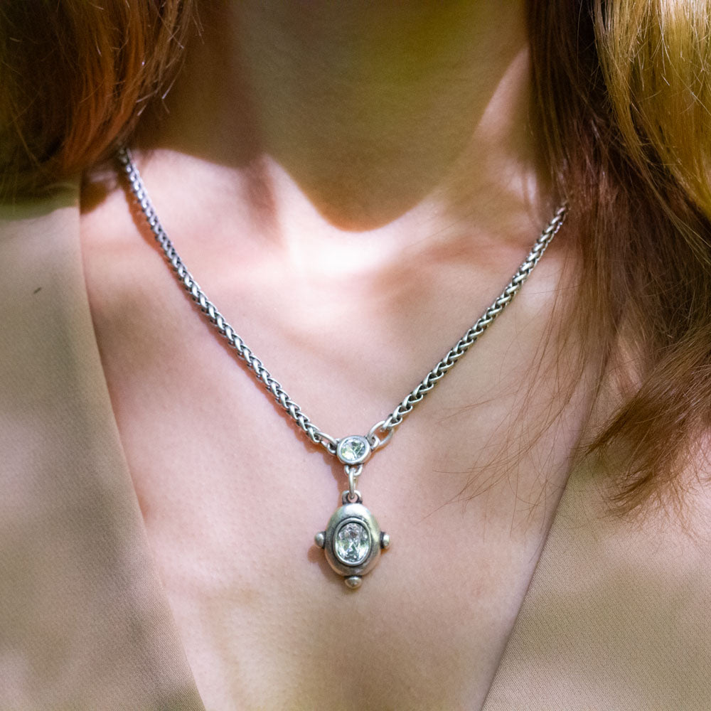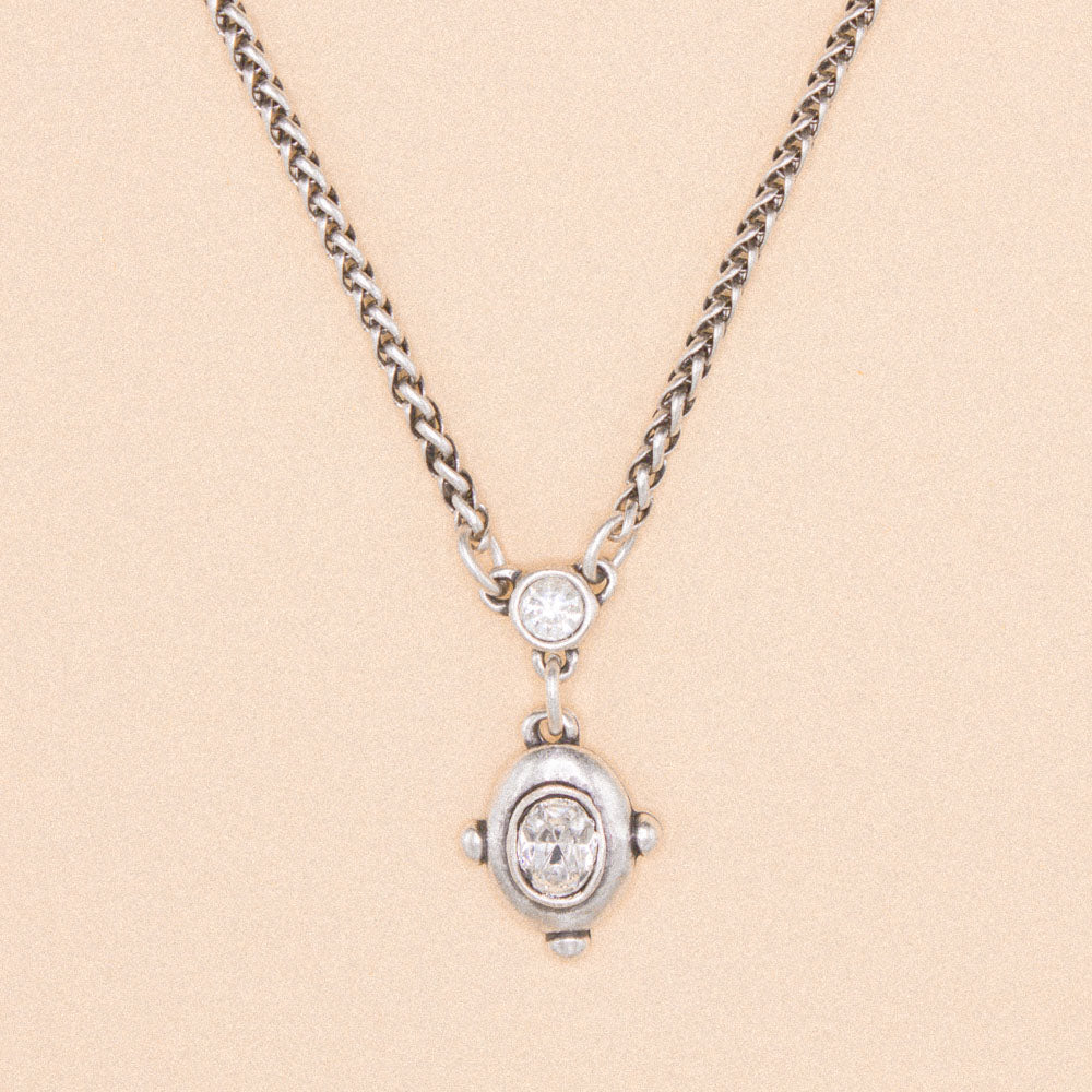 A delicate necklace featuring a small clear gemstone set first, with a larger gemstone elegantly dangling below. The larger stone is encased within a solid oval frame, accented by four circular details protruding evenly around the outer edge, adding a touch of intricate charm to the design.