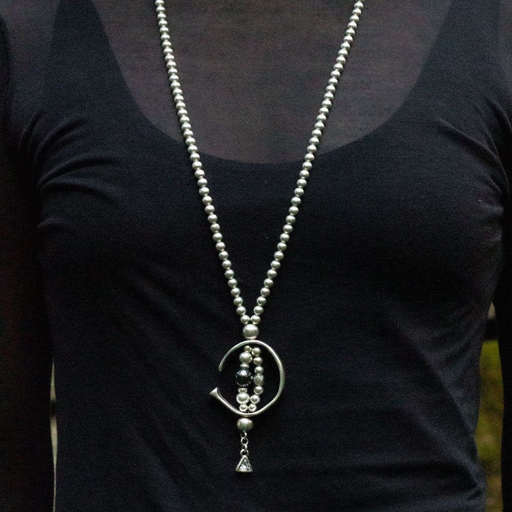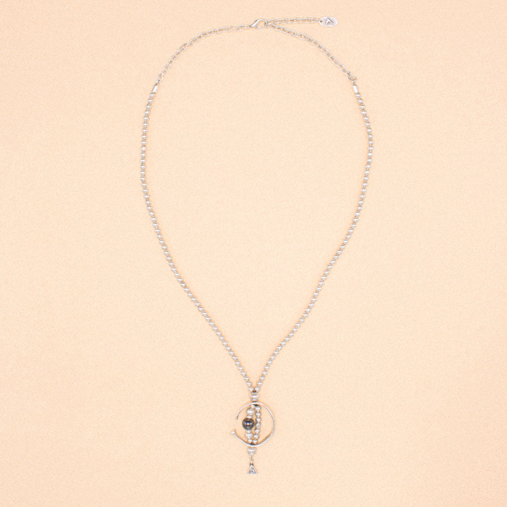 A modern statement piece featuring a sphere ball chain with a sculptural pendant. The curved C-shape holds a deep blue bead and double chain detail, finished with a polished sphere and clear triangle gem drop.